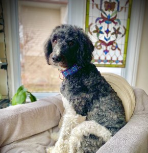 This is Mimi. She is a 6 year old Bernedoodle. Mimi is very intelligent, loving and full of energy. Her favourite activities are fetch and watching wildlife from our kitchen window. Mimi loves walking in nature, playing in the snow and meeting people.